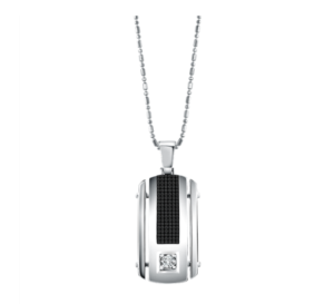 Kalung dengan liontin White Rose Gold 18K. Bentuk liontin menyerupai bar yang menjuntai dengan kokoh. Di tengahnya berbalut berlian. Kalung ini mampu menciptakan kesan maskulin dan kharismatik.